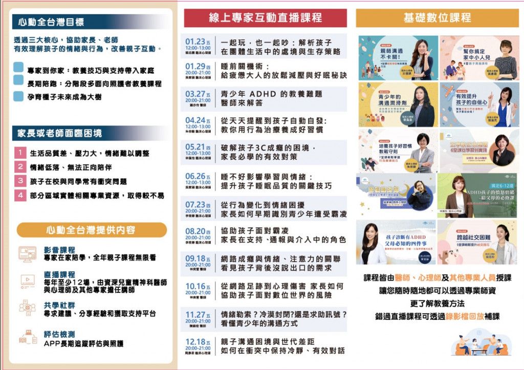 二、本方案課程由兒童心智科醫師、臨床心理師、職能治療師等專家群共同規劃數位影音課程、專家直播課程等。